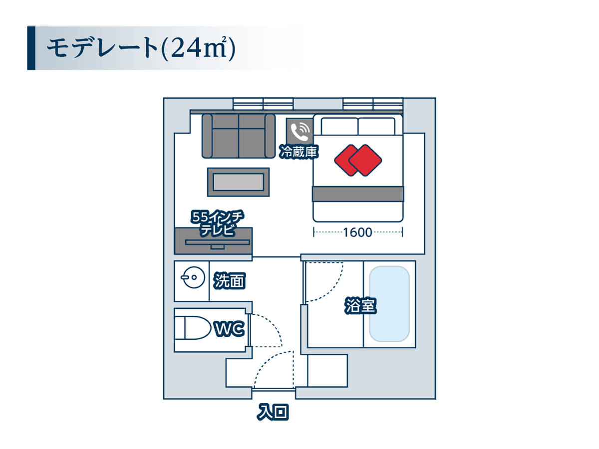 ソファー・テーブルはありませんが、洗面及びトイレと独立した浴槽が付くお部屋です。